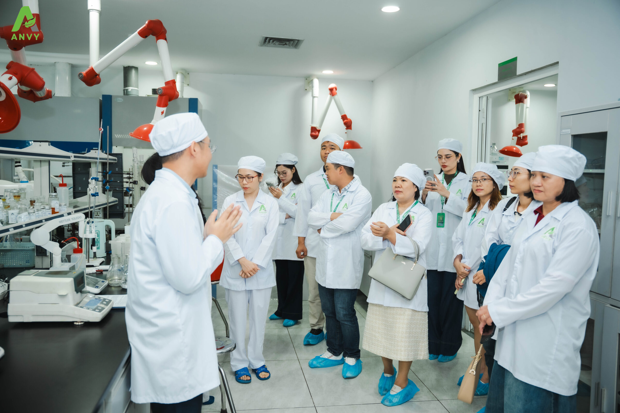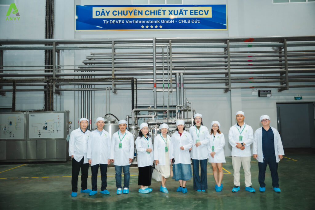Điểm nhấn của hành trình là chuyến tham quan thực tế nhà máy, dưới sự dẫn dắt của Ban lãnh đạo và đội ngũ sản xuất. Tại đây, các đối tác có cơ hội quan sát trực tiếp dây chuyền sản xuất hiện đại, công nghệ chiết xuất EECV, cũng như quy trình kiểm soát chất lượng nghiêm ngặt – những yếu tố cốt lõi làm nên năng lực sản xuất và phát triển bền vững của Anvy.
