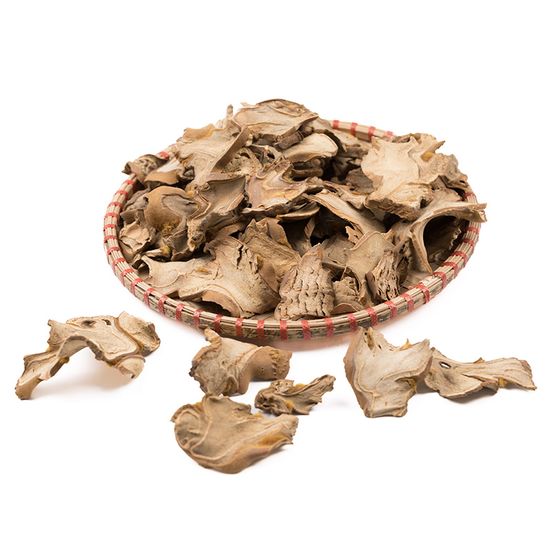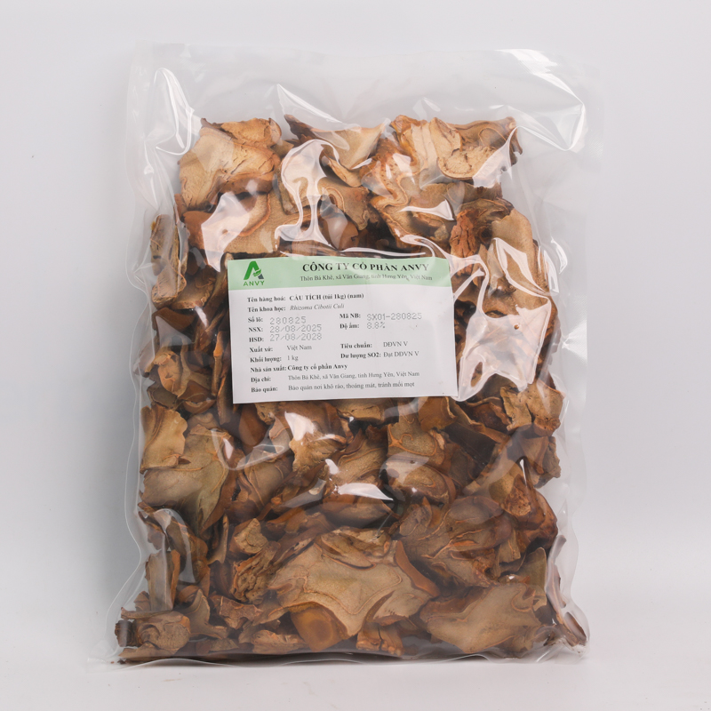 Đoạn thân rễ đã loại bỏ lớp lông màu vàng nâu bên ngoài, mặt ngoài rất gồ ghề, khúc khuỷu, có những chỗ lồi lên thành mấu, màu nâu hoặc nâu hơi đỏ, đường kính 2 cm đến 5 cm, dài 4 cm đến 10 cm, rất cứng, khó cắt, khó bẻ gãy; đôi khi còn sót lại ít lông màu vàng nâu. Dược liệu khi dùng thường đã thái thành phiến mỏng hình dạng thay đổi, mặt cắt ngang nhẵn, màu nâu hồng hay nâu nhạt, có vân.