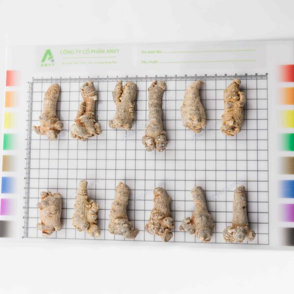 Rễ củ, hình trụ hoặc nón, mặt ngoài màu vàng xám nhạt. Chất cứng rắn, khó bẻ, khó cắt. Khi đập vỡ, phần gồ và phần vỏ dễ tách rời nhau. Mặt cắt ngang có lớp vỏ màu xám nhạt, có những chấm nhỏ màu nâu (ống tiết), phần gỗ ở trong màu xám nhạt, mạch gỗ xếp hình tia tỏa tròn. Mùi thơm nhẹ đặc biệt, vị đắng hơi ngọt.